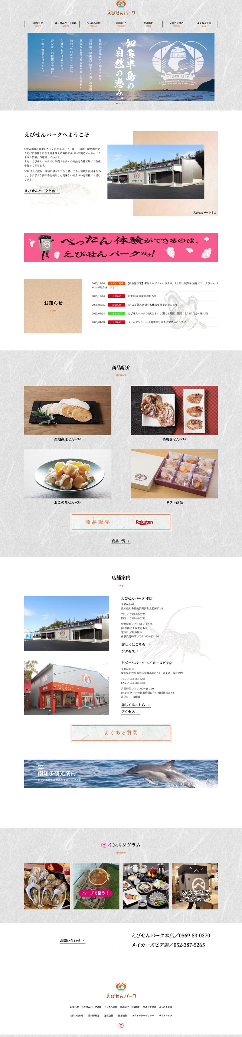 愛知県知多半島にある、えびせんべいの販売店舗「えびせんパーク」。販売店舗の拡張リニューアルにともない、ホームページもリニューアルを行いました。リニューアルにあたってターゲット層を見直し、商品のラインナップを整えることで、以前のWEBサイトからイメージを一新することができました。メインビジュアルの「知多半島の自然の恵み」に合わせて背景に和紙のテクスチャを使用、筆文字によるタイトル、墨絵タッチの海の生物を装飾しています。えびせんパークは観光スポットでもあるので、所在地の南知多観光案内の地図を掲載するなど地域活性化へも配慮したサイト構成になっています。