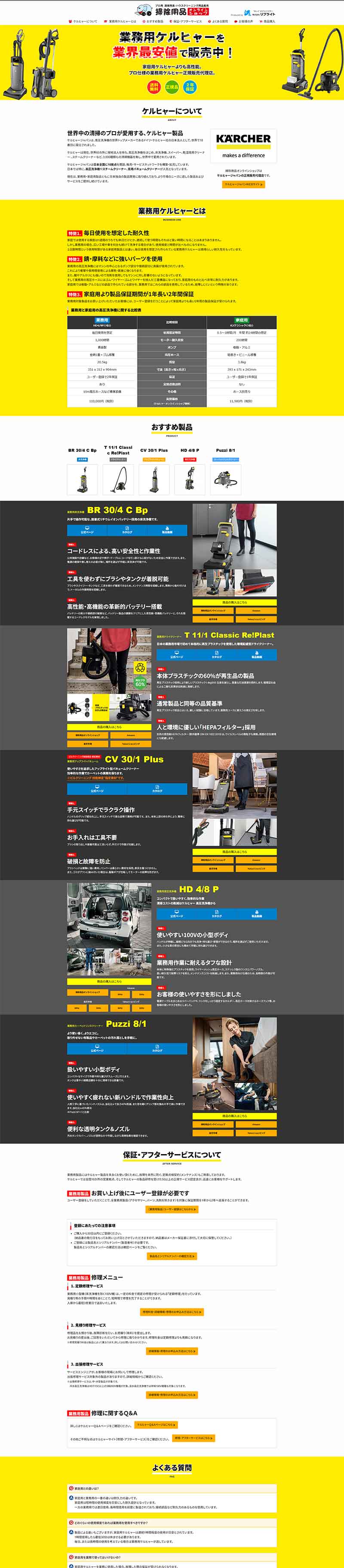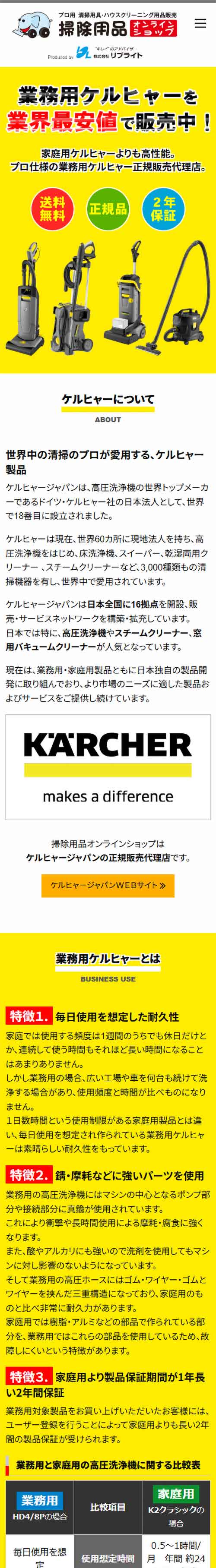 業務用清掃用品販売会社からのご依頼にて「ショッピングサイトへ誘導するためのランディングページ(LP)」を制作。数あるアイテム数の中から厳選した商品をピックアップし、各商品の説明(特徴、使用用途など)を掲載し、自社の販売チャンネルへ誘導します。ランディングページ(LP)は、商品やサービスの魅力を伝える縦長の1枚構成し、ユーザーを離脱させずショッピングサイト(ECサイト)へと導くのが最大の特徴で、商品テイストにあわせたサイトデザインを行います。 。