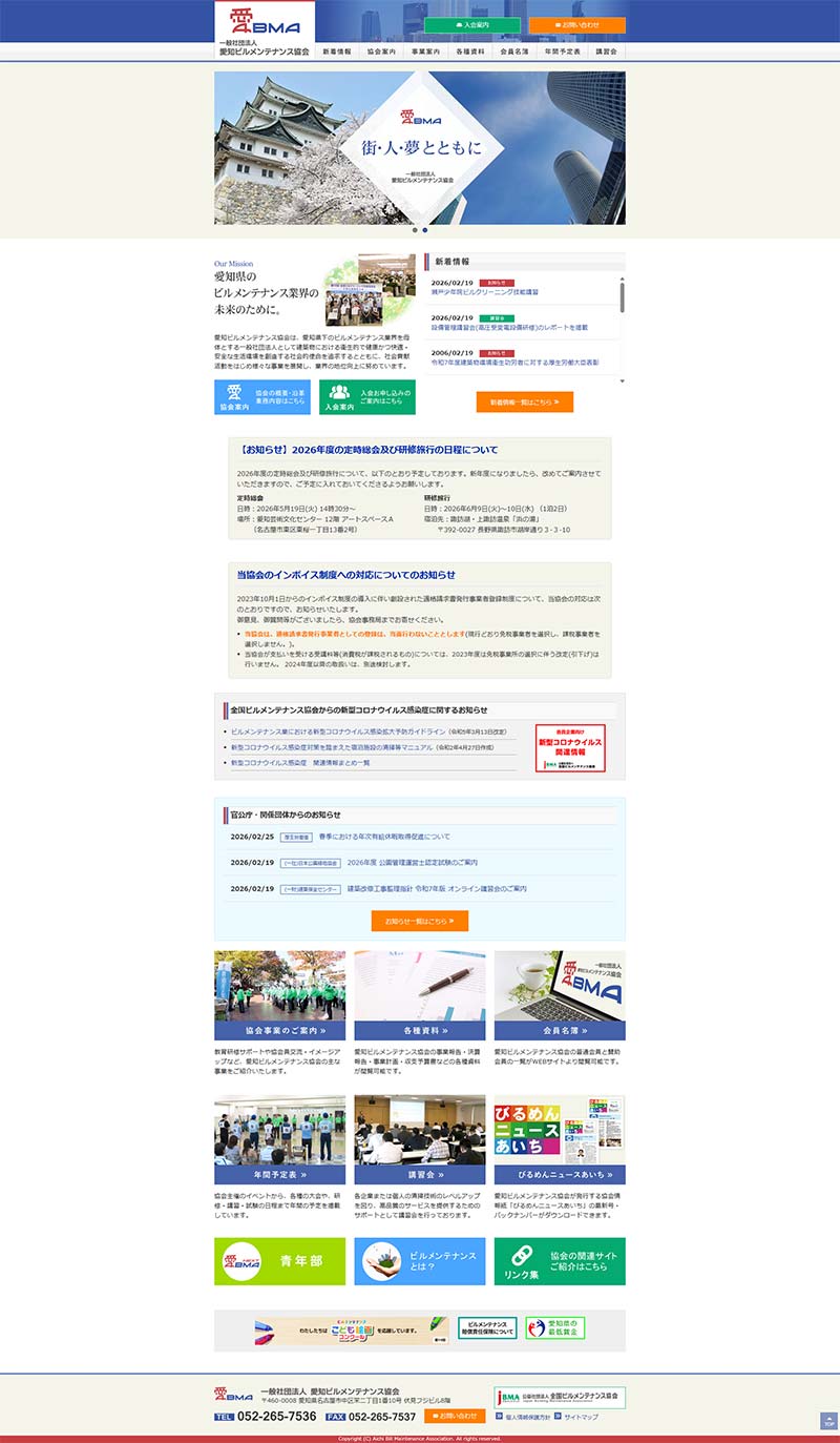 愛知県内にて、ビルメンテナンス・建物の維持管理を行う企業にて構成される協会のWEBサイト制作。普通会員・賛助会員の会員がWEBサイトを閲覧する機会が多いため、情報の整理はもちろん、これまでの活動報告を「わかりやすく・記録に残す」ということに重きを置きます。毎月の更新も数多くある為、日々の更新サポ―トも行っております。