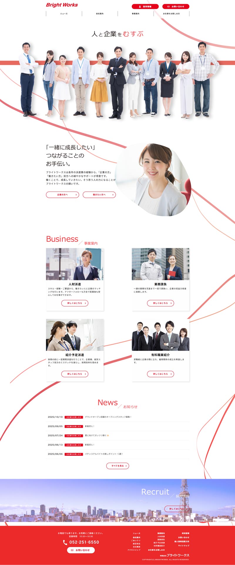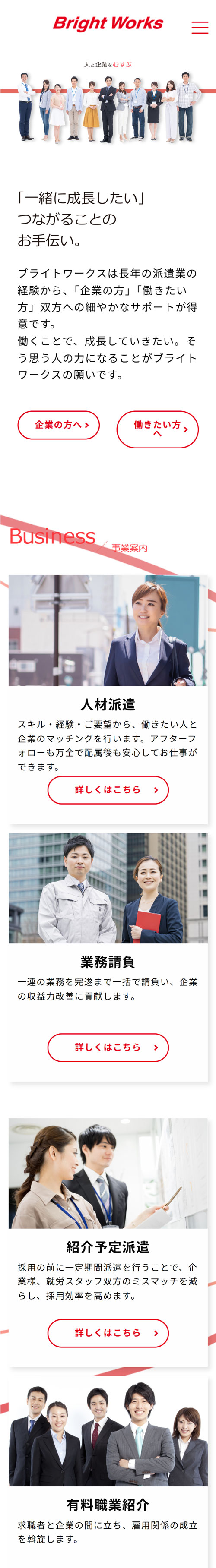 今後の事業拡大・業務拡大を見据え、認知度を高めるためのホームページリニューアルです。「人と企業をむすぶ」というブライトワークスのキャッチコピーを全面に押し出し、背景にリボンを大きくあしらうことで、「むすぶ」という企業理念を意識したデザインにしています。また、サイト全体を通して、笑顔で働く人物の写真を多数掲載することで、親しみやすく働きやすい環境をアピールしたサイトになっています。
