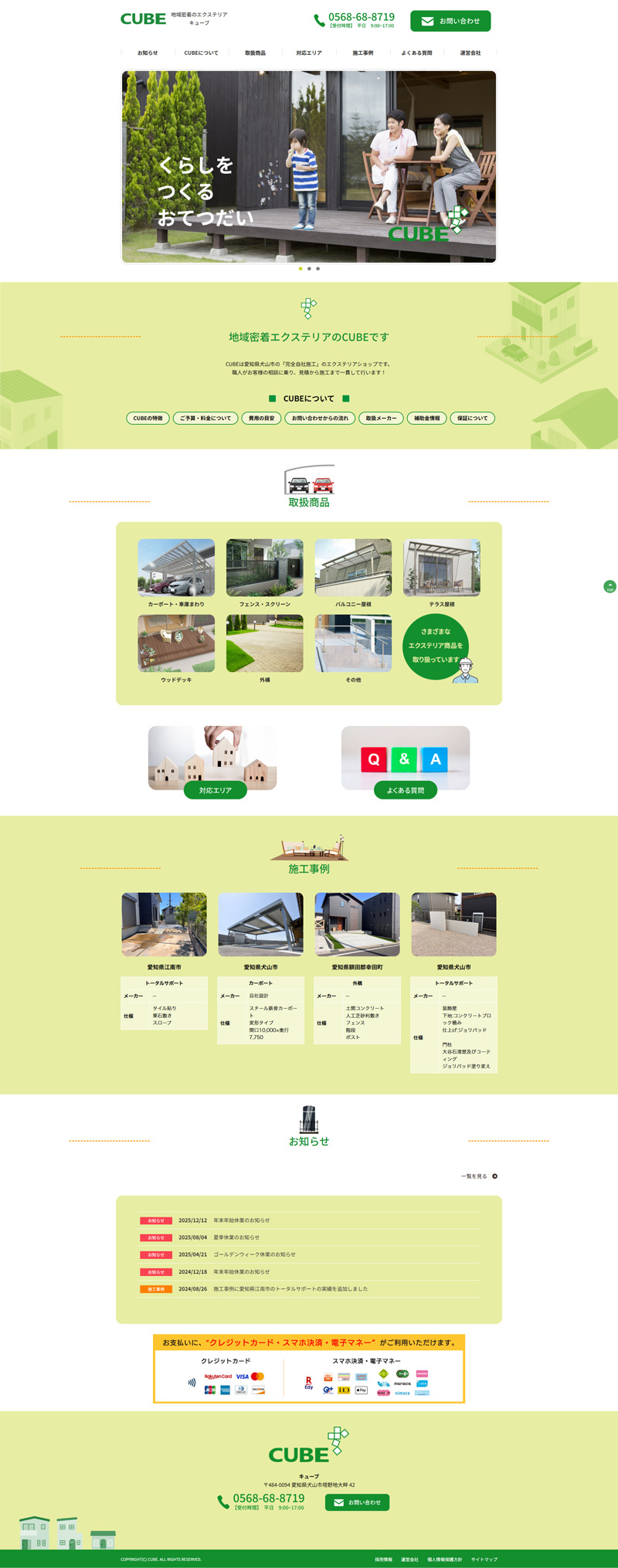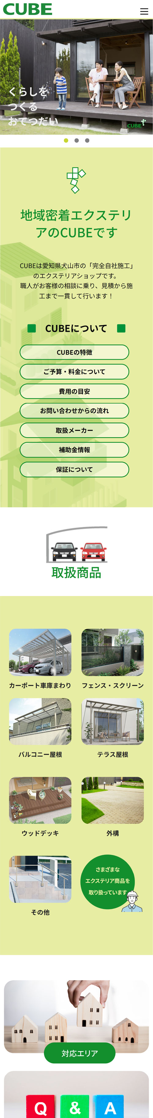 商品であるエクステリアは、取扱商品一覧ページを作成、イメージを用途別に区分し画像と説明文をモーダルウィンドウで直感的に閲覧できるよう工夫しています。また、施工事例としてさらに詳しい内容も掲載。「施工のBefore、After」を見ていただくことで、これから相談しようと検討されている方には、イメージしやすいコンテンツとなります。全体のトーンはロゴのイメージをもとに緑色を基調に、地域に根ざした会社であるという親しみやすさを意識してデザインしてあります。
