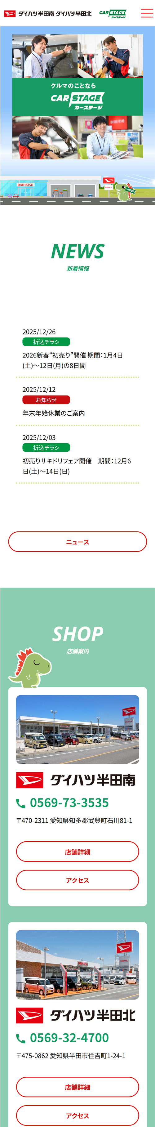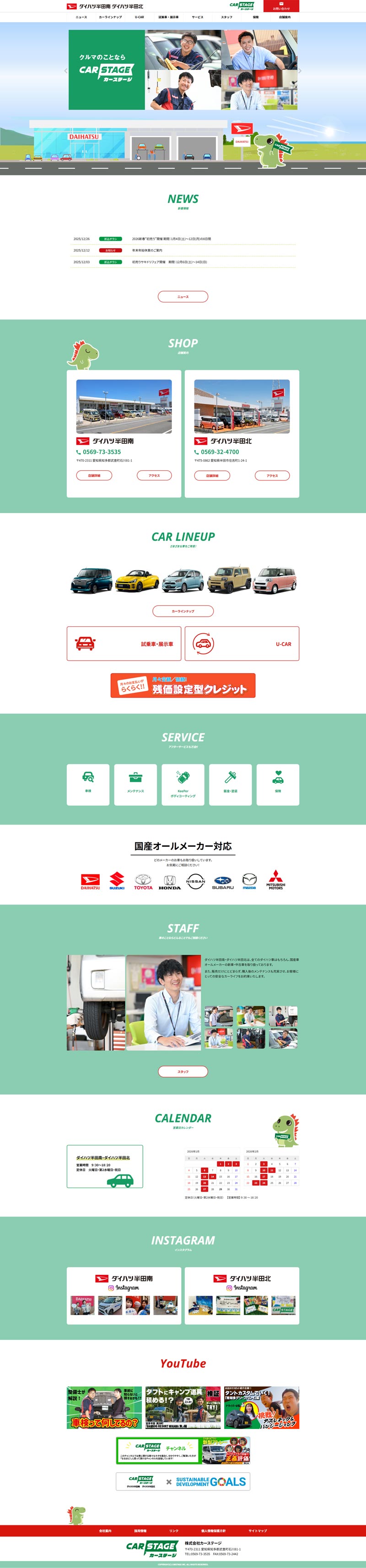 ダイハツ車をメインに販売している、株式会社カーステージ「ダイハツ半田南・半田北」は地域密着型の自動車販売店です。地域密着店だからこそ、「どなたにも見やすく」「ファミリー向け」「高齢の方へ配慮された」をキーワードにデザインを進め、文字サイズに注意しながら窮屈にならないレイアウトを意識しています。お客様とは対面で接客を行うので、店舗写真やスタッフの紹介を充実させ、来店されたときのギャップをなくすことで安心していただけるよう配慮しています。また、車検・鈑金・塗装・ボディコーティングなどアフターサービスにも力を入れていることを紹介したページも充実させました。