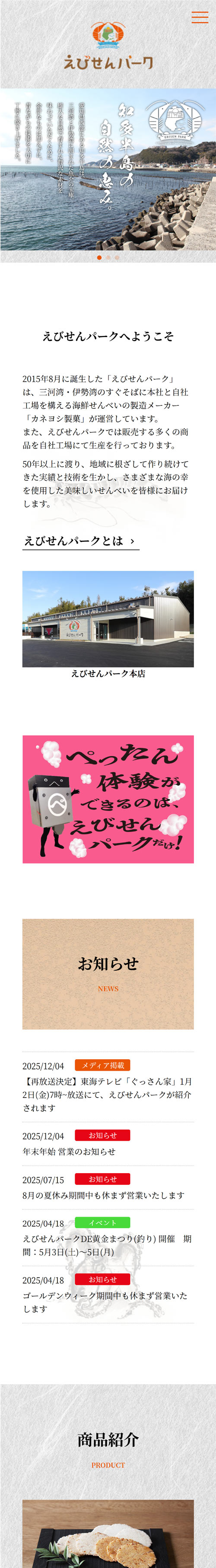 愛知県知多半島にある、えびせんべいの販売店舗「えびせんパーク」。販売店舗の拡張リニューアルにともない、ホームページもリニューアルを行いました。リニューアルにあたってターゲット層を見直し、商品のラインナップを整えることで、以前のWEBサイトからイメージを一新することができました。メインビジュアルの「知多半島の自然の恵み」に合わせて背景に和紙のテクスチャを使用、筆文字によるタイトル、墨絵タッチの海の生物を装飾しています。えびせんパークは観光スポットでもあるので、所在地の南知多観光案内の地図を掲載するなど地域活性化へも配慮したサイト構成になっています。