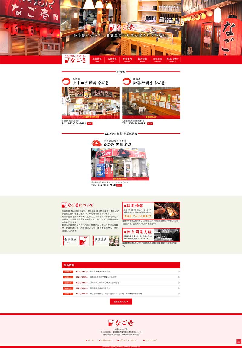 名古屋市の各エリアで居酒屋・お弁当販売店舗を展開する飲食店サイト。店舗情報を表示し「初めて来店するお客様への安心感」を与える情報提供はもちろんのこと、会社(法人)運営も行っているため、仕入れ先、主要銀行、採用活動などのページがあるメリットを理解いただき、長きにわたりサイト運営をサポートしております。